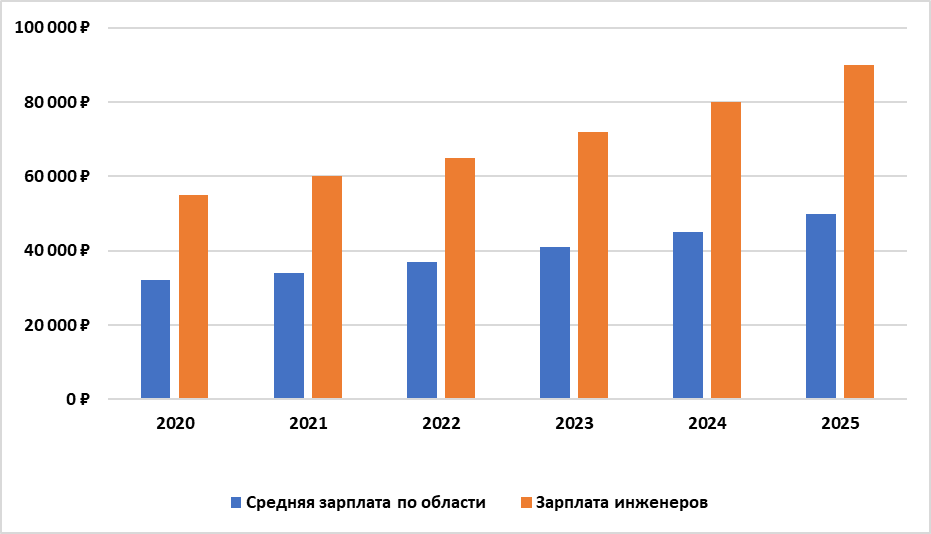 Анализ вакансий показывает, что заработная плата инженеров существенно превышает средний уровень доходов в регионе. В 2025 году средняя зарплата инженеров в Тамбовской области составляет около 90 тысяч рублей в месяц, тогда как средняя заработная плата по региону находится на уровне примерно 50 тысяч рублей. Таким образом, доходы инженеров превышают средний уровень оплаты труда примерно в 1,7–1,8 раза.