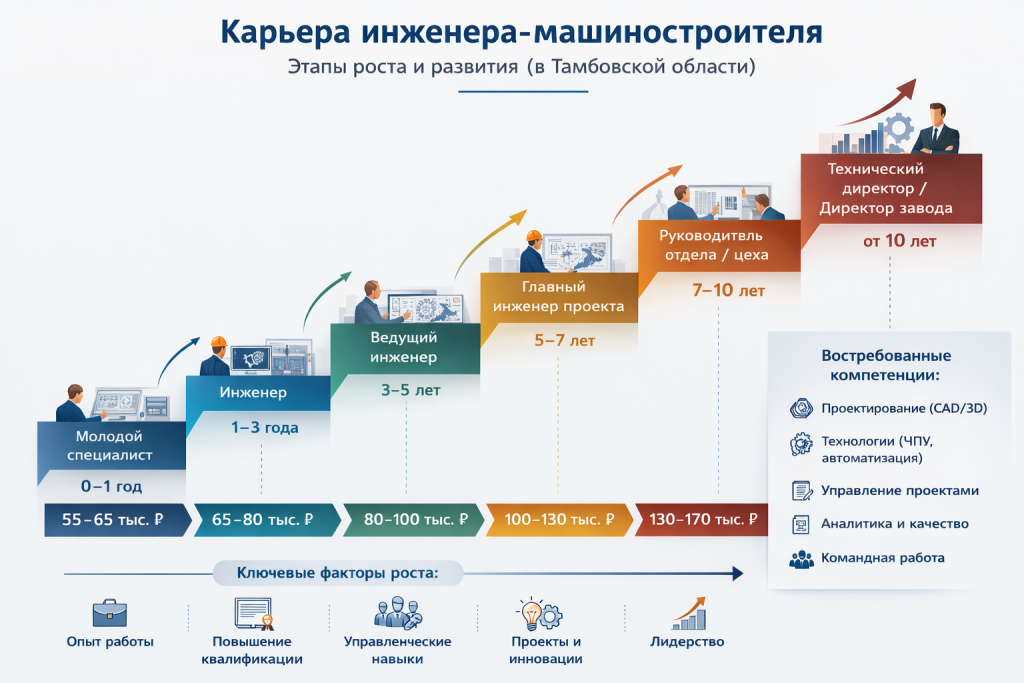 Инженерная профессия отличается не только высокой востребованностью на рынке труда, но и широкими возможностями профессионального роста. На большинстве промышленных предприятий существует чёткая система карьерного развития, которая позволяет молодому специалисту постепенно переходить от выполнения отдельных инженерных задач к управлению крупными техническими проектами и производственными подразделениями.
