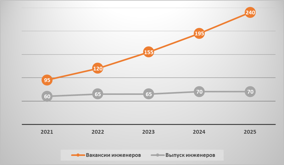 И теперь самое интересное. Как было показано выше, потребность предприятий составляет порядка 150 инженеров в год. При этом выпуск составляет около 60. В разрезе последних лет ситуация получается такая: